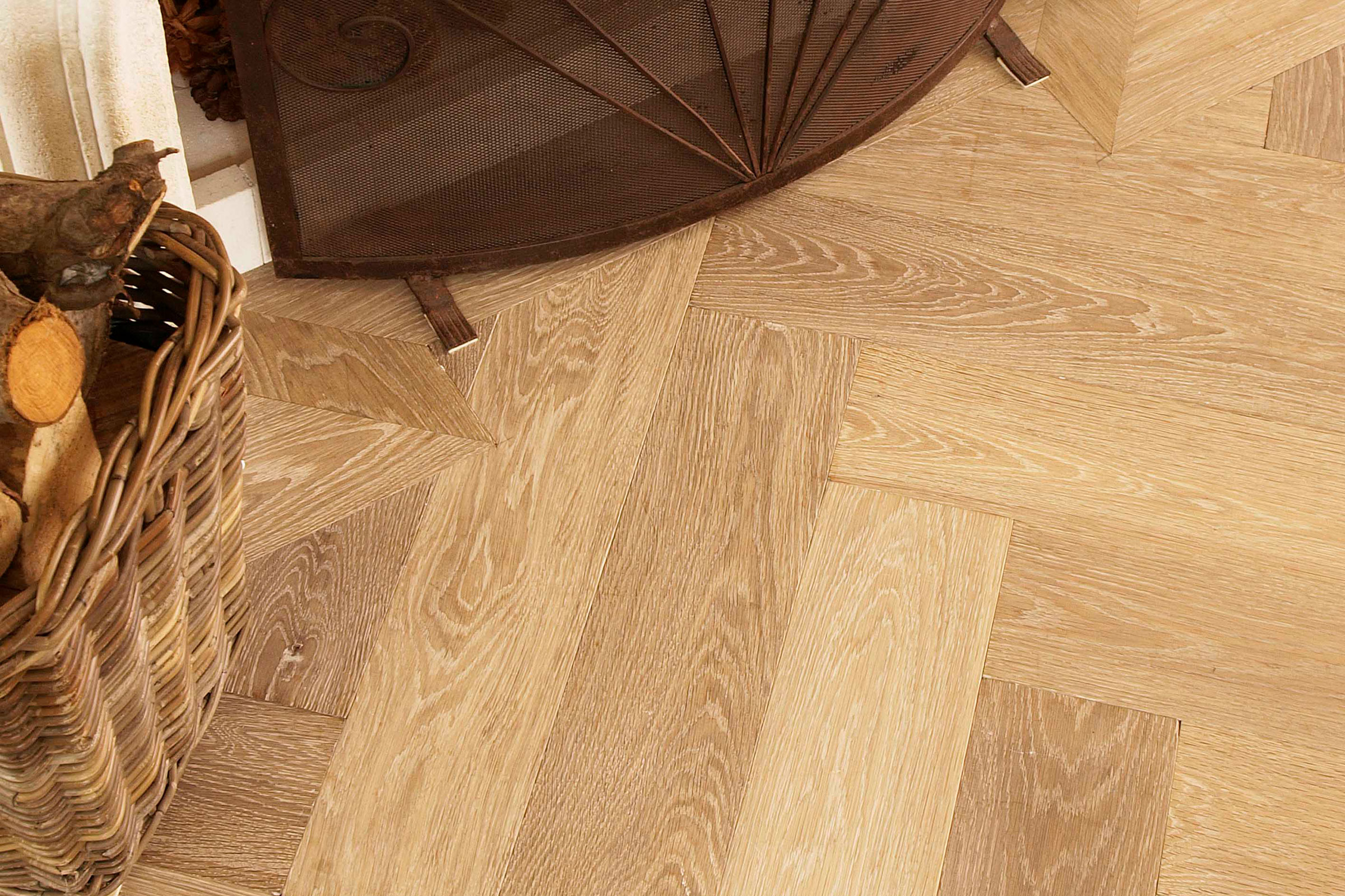 Das Fischgrätmuster besteht aus Hartholzstäben, die in einem 90-Grad-Winkel zueinander angeordnet sind. Die Stäbe bilden parallele Linien, die in der Mitte zusammenlaufen und sich in entgegengesetzte Richtungen bewegen. Der Bodenbelag ist in verschiedenen Farben und Oberflächenbehandlungen erhältlich und besteht in der Regel aus Hartholz wie Eiche, Esche oder Walnuss.