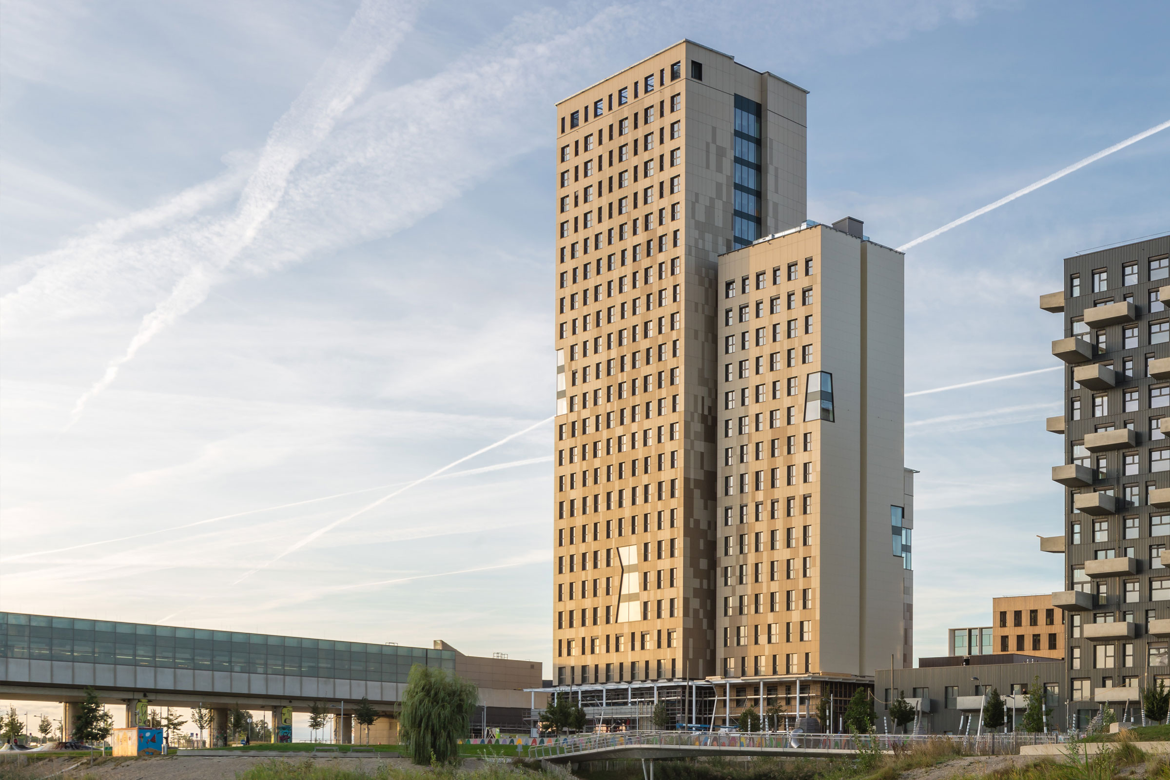 Roots wird das höchste Holzhochhaus Deutschlands. Von den insgesamt 18 Etagen entstehen 16 in Holzbauweise. Die werkseitig vorgefertigten Wandelemente in Holzrahmenbauweise umfassen eine Fläche von 16.200 m². Insgesamt werden mehr als 5.500 m³ Nadelholz (davon 4.430 m³ Brettsperrholz und 820 m³ Sonderhölzer) verarbeitet. Allein dieses Materialvolumen spart gegenüber der Herstellung, dem Transport und der Entsorgung konventioneller Baustoffe schätzungsweise 26.000 Tonnen CO2 ein.